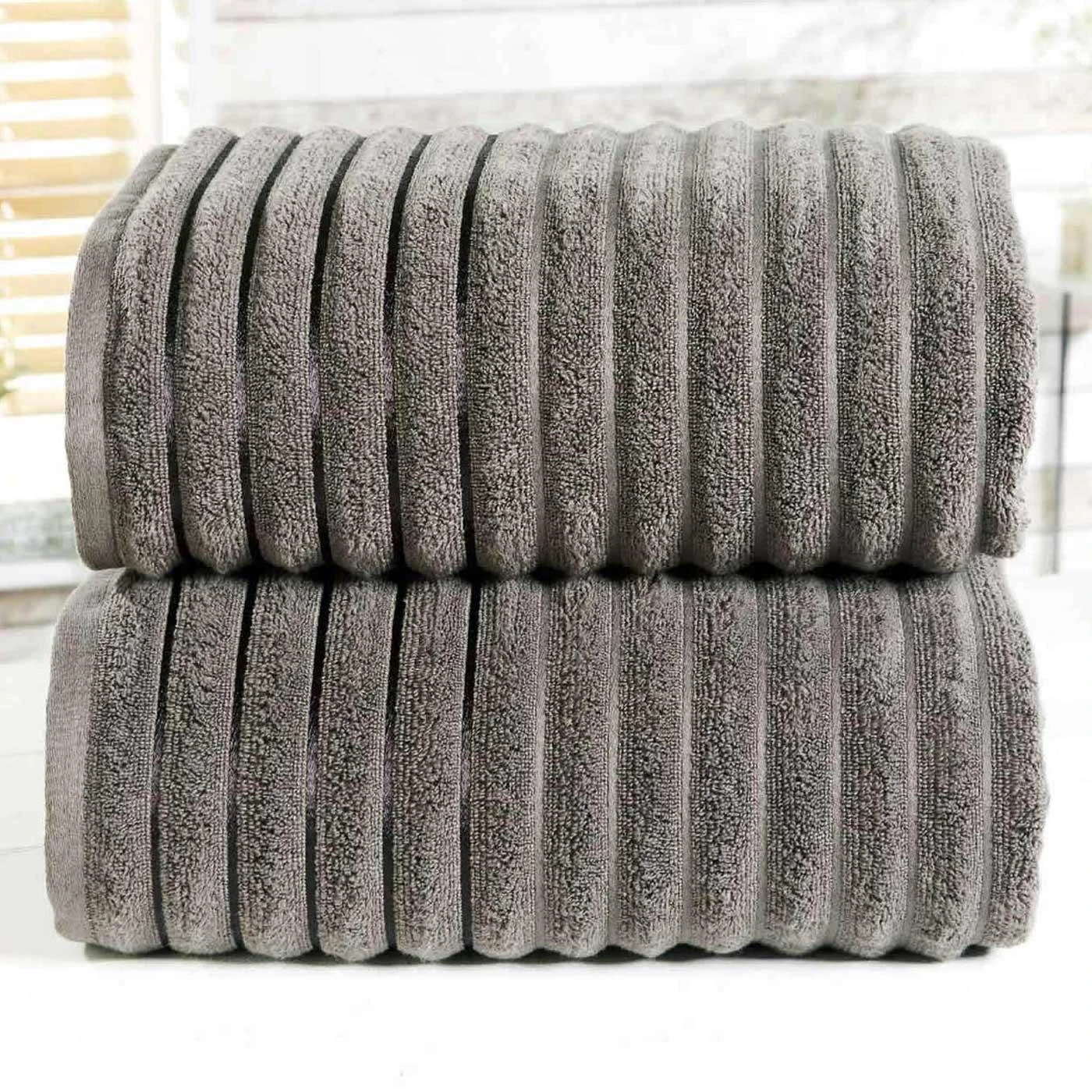 Luxuriously plush charcoal grey Ribbed bathroom towels featuring an all-over textured stripe effect. Each towel is crafted in 100% luxury pure cotton ensuring ultimate comfort and fast results when drying off after stepping out of a hot shower or relaxing bath.